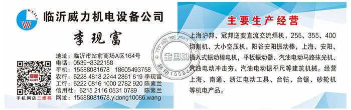 主要生产经营 上海沪邦、冠邦逆变直流交流焊机,255、355、400 切割机、大小空压机,阳谷安阳振动棒,上海、安阳、 插入式平板振动电机,马路抹光机、电动汽油冲击夯、 振平尺等建筑机械。经营上海、南通、浙江电动工具、 台钻、台锯、砂轮机等机电产品。